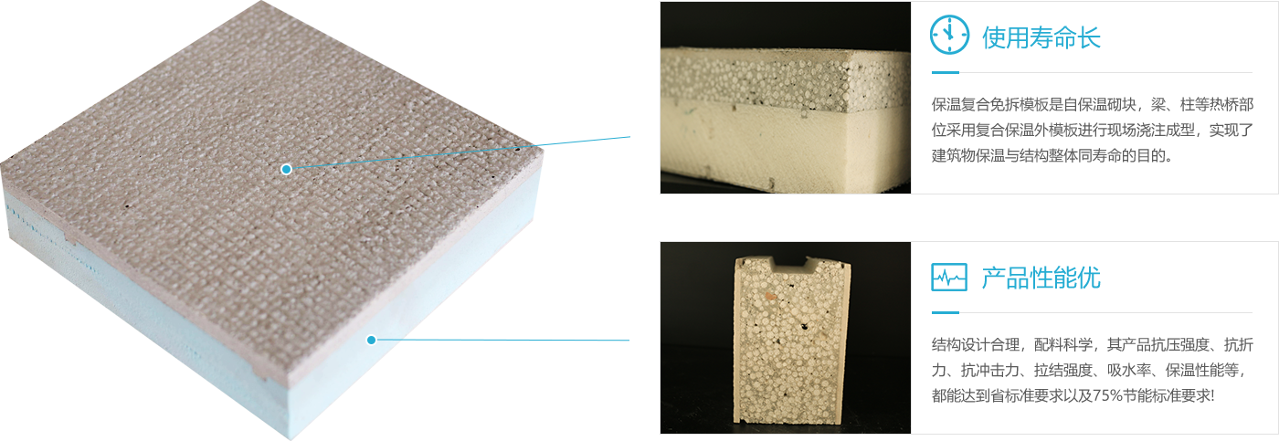 具有較高的力學(xué)強度,可直接做外模板使用,保溫隔熱性能良好,滿足建筑節(jié)能65%—75%的標準要求。